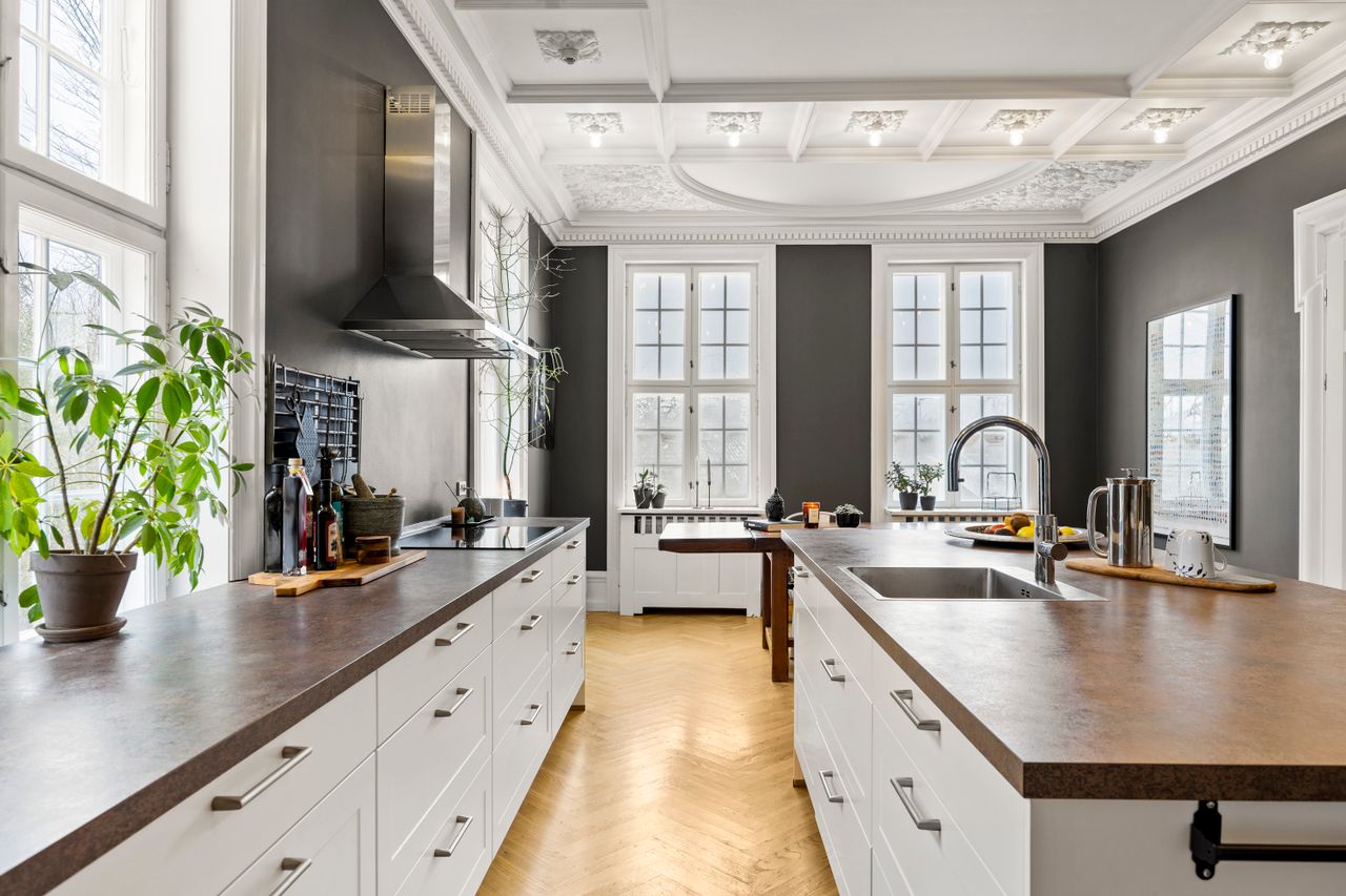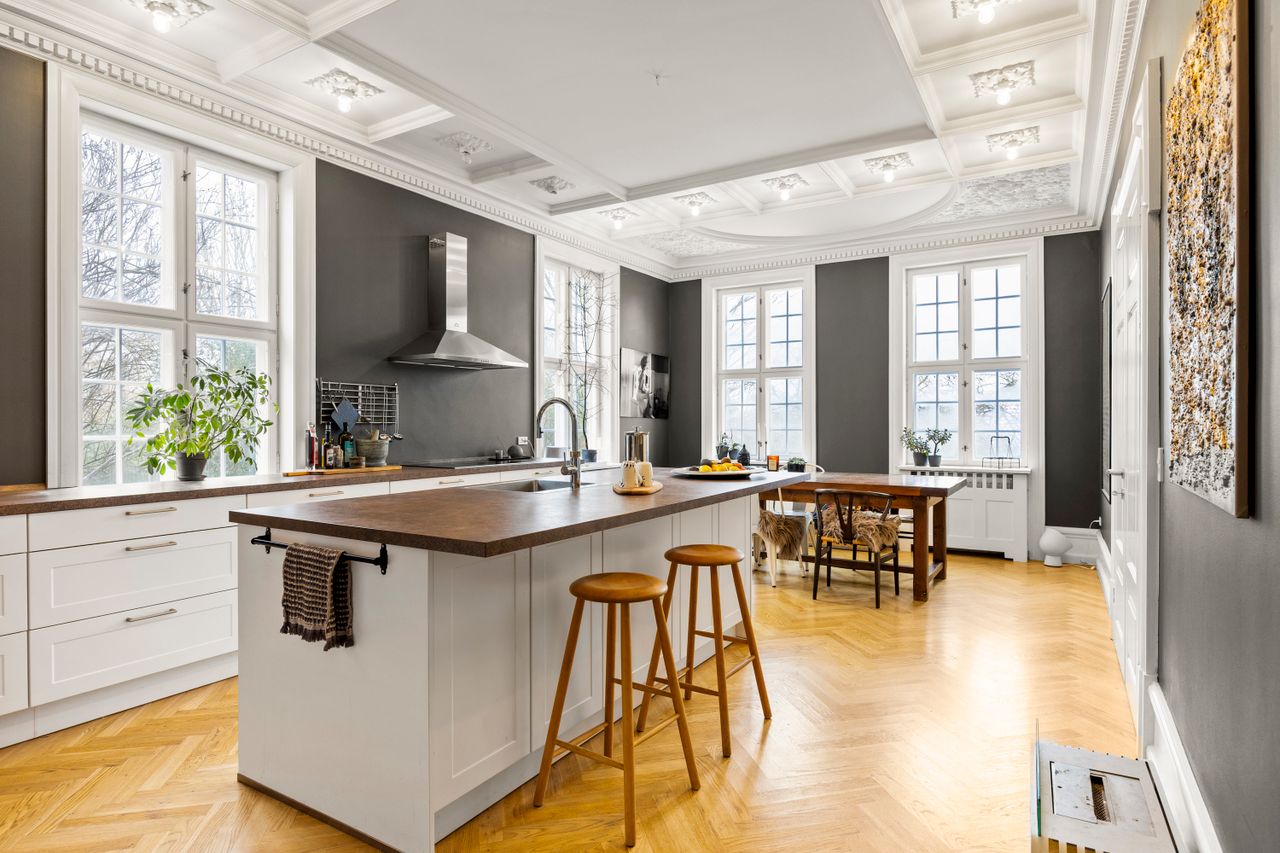Boligens naturlige omdrejningspunkt er det store køkken-alrum, der er etableret i den oprindelige spisestue. Her mødes man af en unik stukatur i absolut særklasse – ganske enkelt noget, der kun ses meget få steder – og som vidner om ejendommens fornemme ophav. Et rum, der både imponerer visuelt og fungerer perfekt til hverdagsliv såvel som større selskaber.